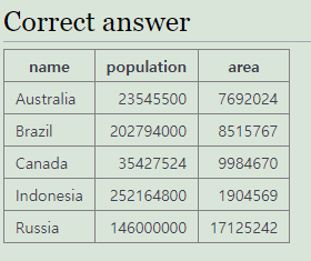 namecontinentarea populationgdp AfghanistanAsia6522302550010020343000000 AlbaniaEurope28748 2831741 12960000000 AlgeriaAfrica2381741 37100000 188681000000 AndorraEurope46878115 3712000000 AngolaAfrica1246700 20609294 100990000000 ... In this tutorial you w